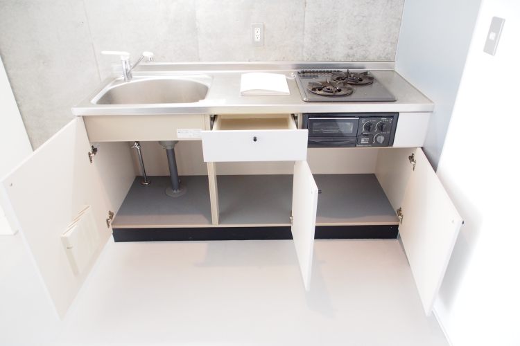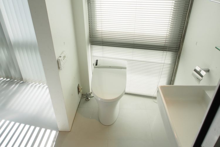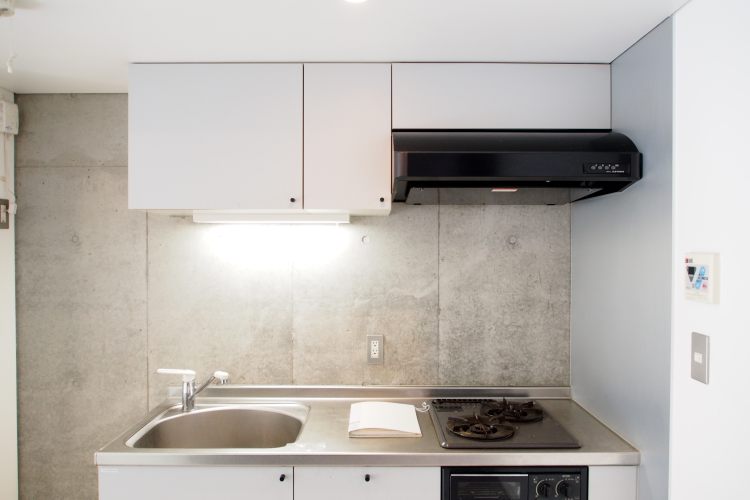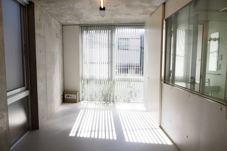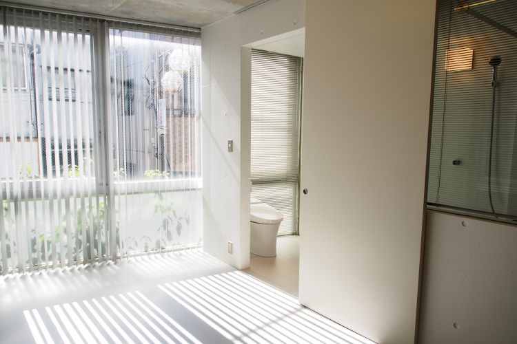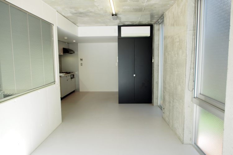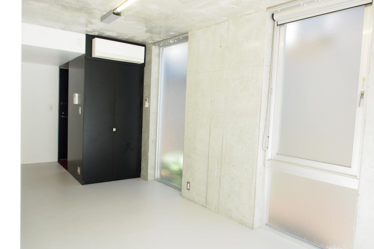 本物件の特徴はコンクリート打ちっぱなしのきりりとしたかっこ良い内装に、黒で引き締めたクローゼットや水周り。そんなかっこ良い内装なのだけど、窓が多く、どこの窓からも優しい光が室内に注ぎ込み、どこか親しみやすい雰囲気を醸し出しています。
