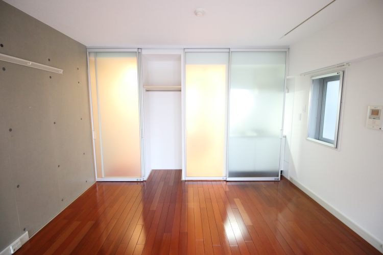 居室内は、コンクリート打ちっぱなしの壁に、フローリングが敷かれた床、照明を自由に取り替えることが出来るダクトレールに、飴色のスライドドア、どれも拘りある素材が使われた、とてもオシャレなお部屋です。