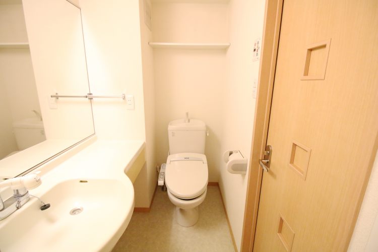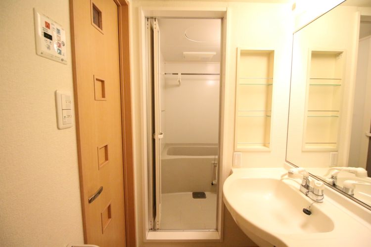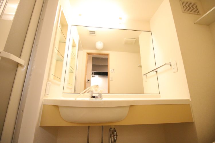 ・設備:一番気に入ったのは鏡が大きなハンドシャワー付きの独立洗面台です。鏡が大きめの洗面台にはなかなか出会えないのですが、こちらは嬉しいポイントです。その他、浴室乾燥機付きの浴室、ウォシュレット付きのトイレ、グリルに2口ガスコンロ・シンクが広めのキッチンが付帯しています。