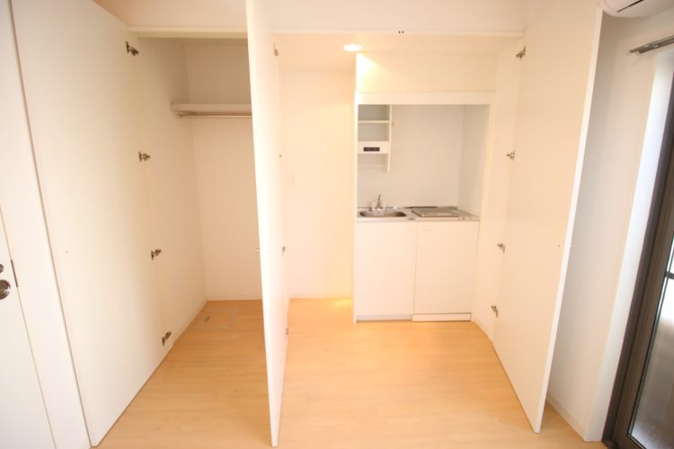 狭い室内ですが、その中に様々な工夫が施されています。例えば、キッチンは扉で隠せてしまったり、一応トイレとシャワーは扉で区別されていたり。