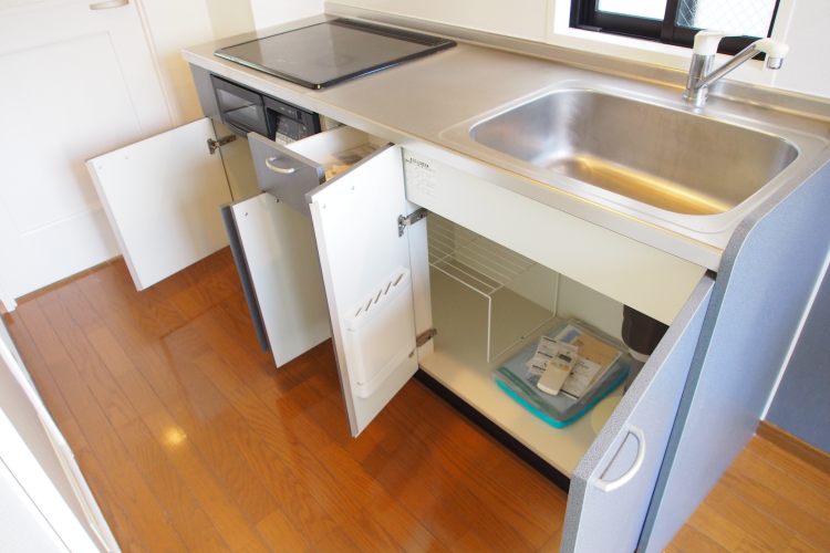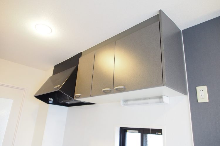 • キッチン上には収納棚、レンジフードが設けられています。