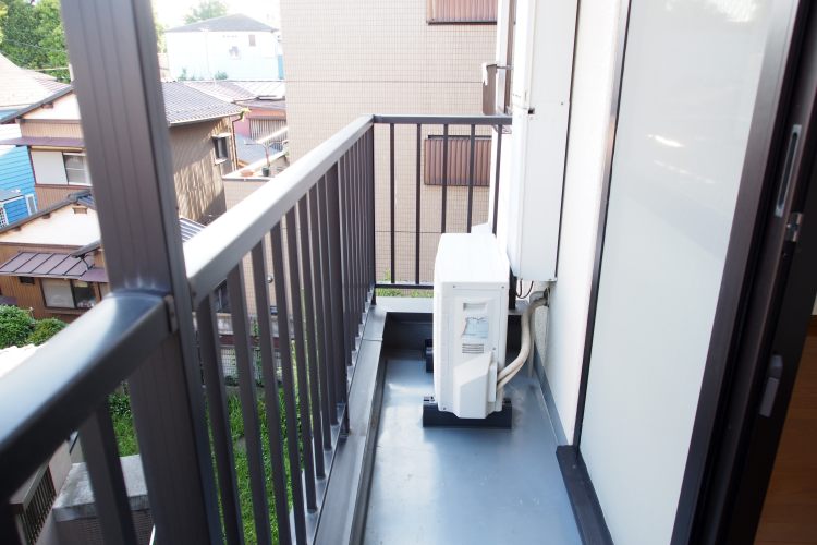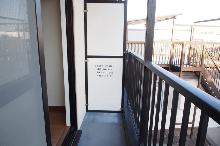 • 南向きのバルコニーに出て左側です。隣のバルコニーとは間仕切りで仕切られています。