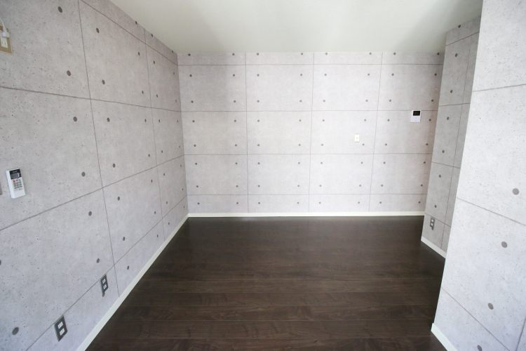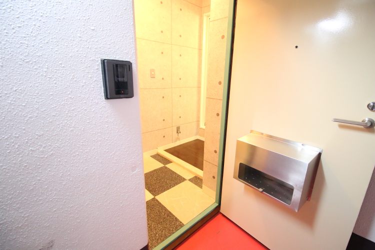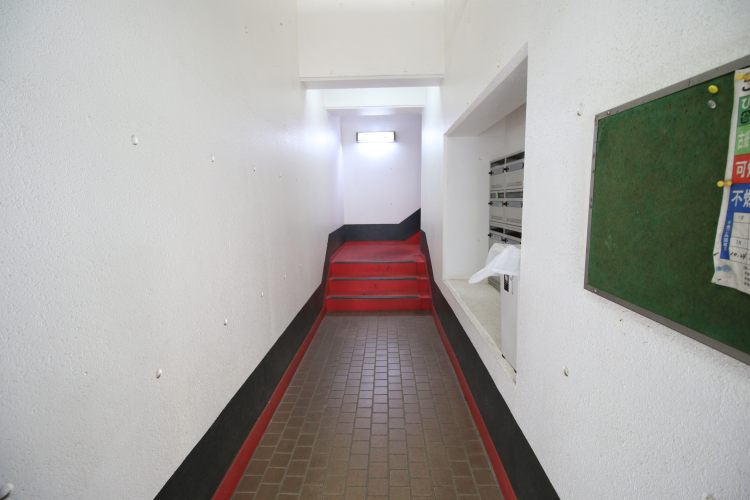 室内はオシャレなデザイナーズ。コンクリート打ちっぱなしに、エントランスには白黒のタイルが敷かれ、ポストはステンレスの真四角型。