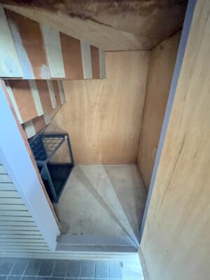 玄関外にある、大容量の収納スペース。アウトドア用品や季節家電、災害備蓄品などかさばるものをすっきり収納。