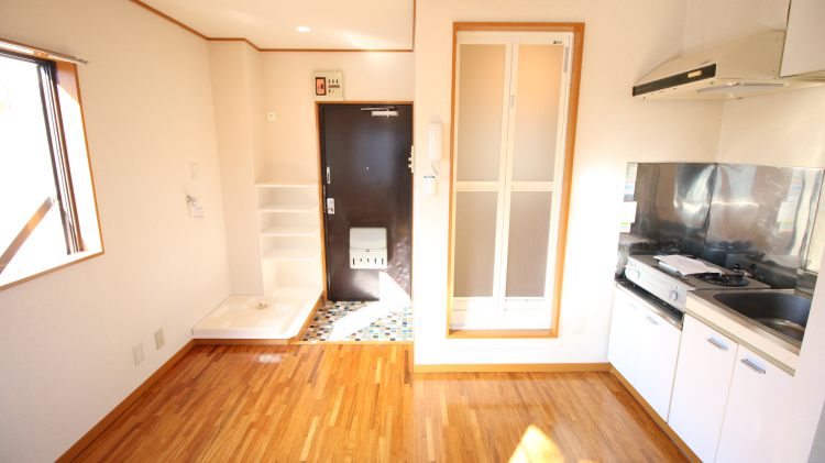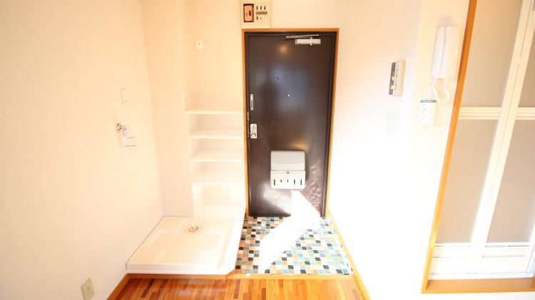 お部屋はこじんまり感がかわいい1R。玄関のカラフルなタイルが、窓から入ってくる光に反射してキラキラとお部屋にアクセントを加えてくれています。1987年築ですが、お部屋はリノベーションされて、きれいに。