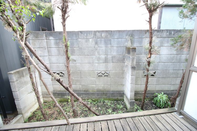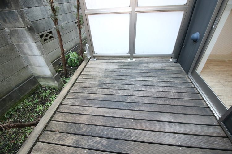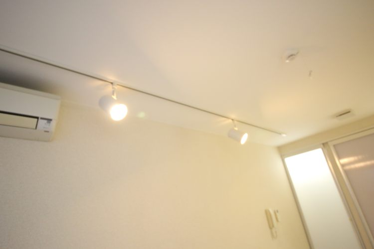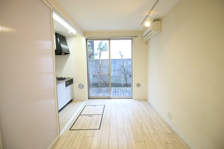 スポットライトがフローリングを照らすお部屋。窓の外にはちょっと広めのウッドデッキが敷かれています。さわやかな風が吹き込みそうな、優しい感じのする内装です。