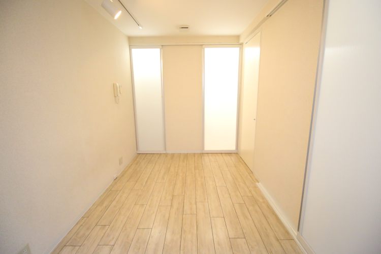 室内はエントランスを入ってすぐにリビングが見通せる間取り、お客様が来たときに活躍してくれそうな、キッチン・エントランス・クローゼットを隠してくれるスライド式のドアが付いており、全て隠すとすっきりした白の空間が生まれます。